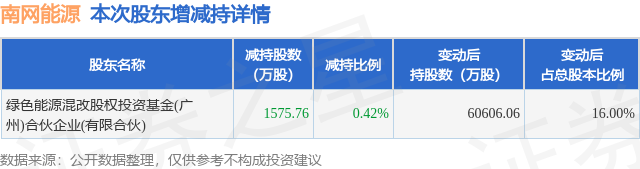 证券之星消息,4月24日南网能源发布公告《南网能源:关于持股5%以上股东减持股份触及1%整数倍的公告》,其股东绿色能源混改股权投资基金(广州)合伙企业(有限合伙)于2026年4月17日至2026年4月24日间合计减持1575.76万股,占公司目前总股本的0.416%,变动期间该股股价上涨7.02%,截止4月24日收盘报8.38元。