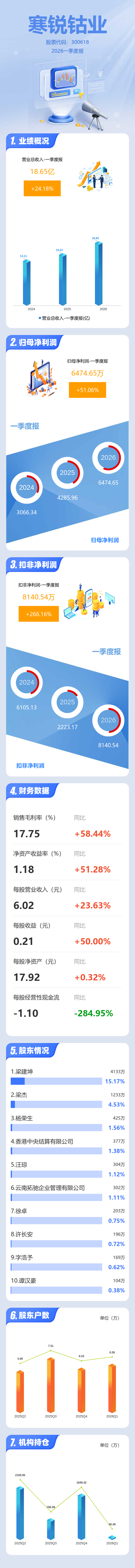 证券之星消息,寒锐钴业2026年一季报显示,一季度公司主营收入18.65亿元,同比上升24.19%;归母净利润6474.65万元,同比上升51.07%;扣非净利润8140.54万元,同比上升266.17%;负债率41.35%,投资收益-174.83万元,财务费用3536.72万元,毛利率17.75%。