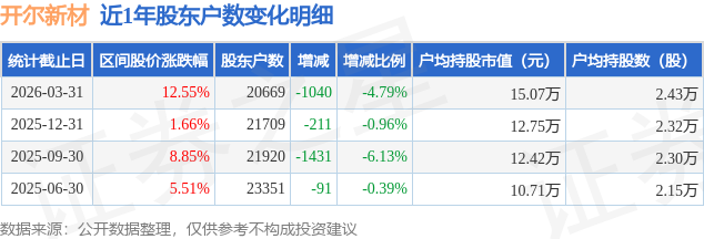 从股价来看,2025年12月31日至2026年3月31日,开尔新材区间涨幅为12.55%,在此期间股东户数减少1040.0户,减幅为4.79%。