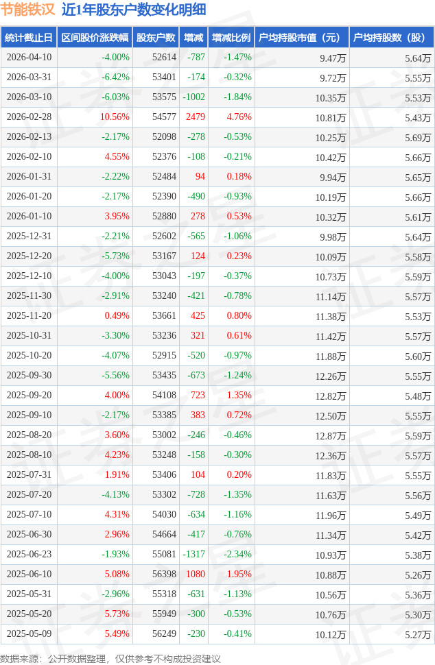 从股价来看,2026年3月31日至2026年4月10日,节能铁汉区间跌幅为4.0%,在此期间股东户数减少787.0户,减幅为1.47%。