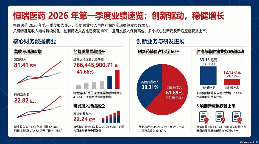 恒瑞医药一季报显示,公司实现营收81.41亿元,同比增长12.98%;归母净利润22.82亿元,同比增长21.78%。创新药销售收入占比首次突破六成,达61.69%,其中非肿瘤产品收入同比增长92.13%,多元化趋势明显。报告期内累计研发投入22.24亿元,3项创新成果获批,8项新药上市申请获受理,管线推进节奏加快。