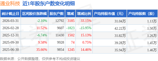 从股价来看,2026年2月28日至2026年3月31日,通业科技区间跌幅为2.1%,在此期间股东户数增加3185.0户,增幅为33.15%。
