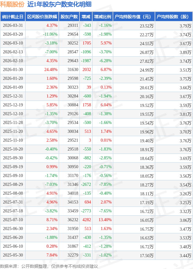 证券之星消息,近日科顺股份披露,截至2026年3月31日公司股东户数为2.93万户,较3月20日减少343.0户,减幅为1.16%。户均持股数量由上期的3.74万股增加至3.79万股,户均持股市值为23.52万元。