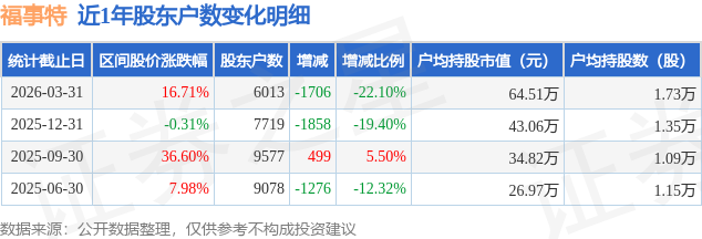 证券之星消息,近日福事特披露,截至2026年3月31日公司股东户数为6013.0户,较12月31日减少1706.0户,减幅为22.1%。户均持股数量由上期的1.35万股增加至1.73万股,户均持股市值为64.51万元。