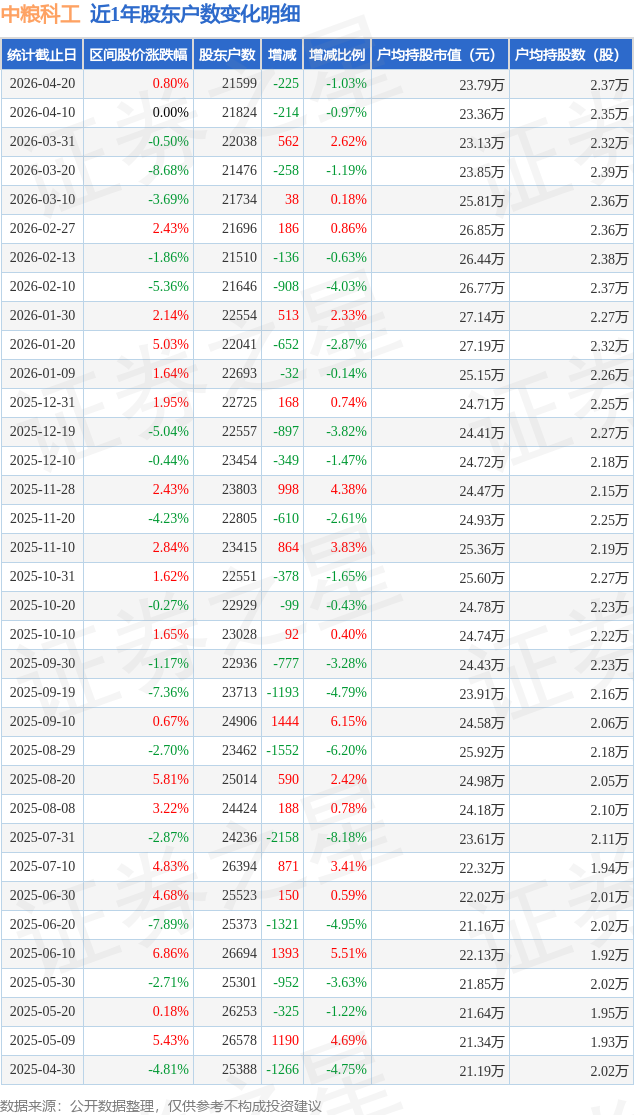 证券之星消息,近日中粮科工披露,截至2026年4月20日公司股东户数为2.16万户,较4月10日减少225.0户,减幅为1.03%。户均持股数量由上期的2.35万股增加至2.37万股,户均持股市值为23.79万元。