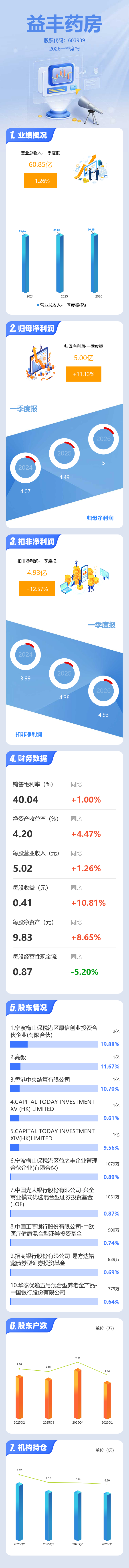 证券之星消息,益丰药房2026年一季报显示,一季度公司主营收入60.85亿元,同比上升1.26%;归母净利润5.0亿元,同比上升11.14%;扣非净利润4.93亿元,同比上升12.57%;负债率51.86%,投资收益2776.7万元,财务费用2798.28万元,毛利率40.04%。