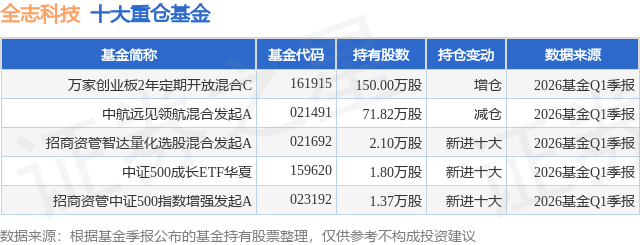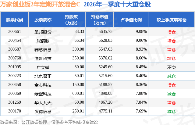 根据2026基金Q1季报公募基金重仓股数据,重仓该股的公募基金共5家,其中持有数量最多的公募基金为万家基金的万家创业板2年定期开放混合C。万家创业板2年定期开放混合C目前规模为0.97亿元,最新净值0.7802(4月21日),较上一交易日下跌1.34%,近一年上涨18.45%。该公募基金现任基金经理为黄兴亮。黄兴亮在任的基金产品包括:万家行业优选混合(LOF),管理时间为2019年3月2日至今,期间收益率为165.31%;万家经济新动能混合A,管理时间为2019年10月30日至今,期间收益率为88.42%;万家自主创新混合A,管理时间为2020年2月10日至今,期间收益率为19.67%;