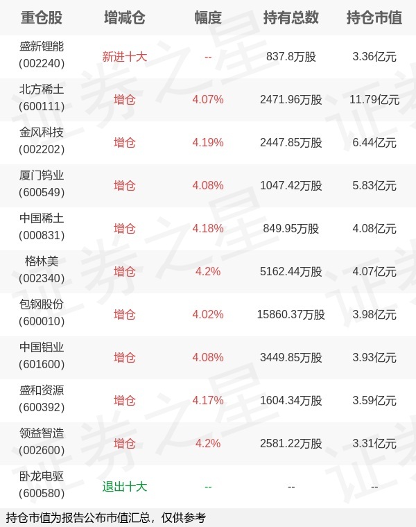证券之星消息,4月22日嘉实基金旗下田光远管理的嘉实中证稀土产业交易型开放式指数基金公布一季报,近1年净值增长率94.43%。与上一季度相比,该基金前十大重仓股新增盛新锂能;并对北方稀土增仓96.65万股,为该基金第一大重仓股;卧龙电驱等退出前十大重仓股;详细数据如下:以上内容为证券之星据公开信息整理,由AI算法生成(网信算备310104345710301240019号),不构成投资建议。相关 ETF