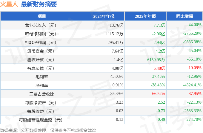 据证券之星公开数据整理,近期火星人(300894)发布2025年年报。截至本报告期末,公司营业总收入7.71亿元,同比下降44.0%,归母净利润-2.96亿元,同比下降2755.29%。按单季度数据看,第四季度营业总收入1.93亿元,同比下降46.72%,第四季度归母净利润-7783.49万元,同比下降1874.64%。本报告期火星人三费占比上升明显,财务费用、销售费用和管理费用总和占总营收同比增幅达87.95%。