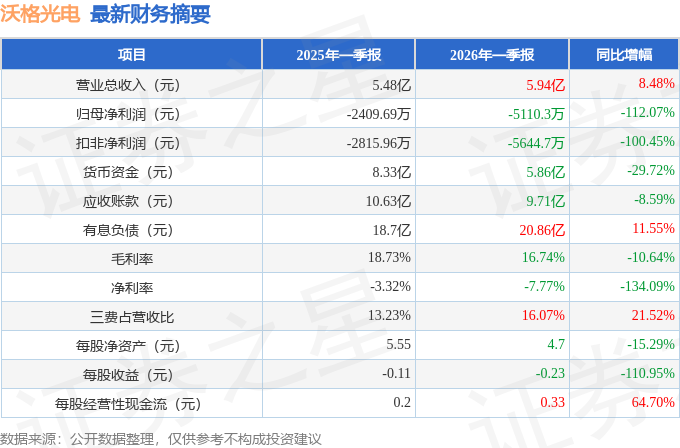 据证券之星公开数据整理,近期沃格光电(603773)发布2026年一季报。截至本报告期末,公司营业总收入5.94亿元,同比上升8.48%,归母净利润-5110.3万元,同比下降112.07%。按单季度数据看,第一季度营业总收入5.94亿元,同比上升8.48%,第一季度归母净利润-5110.3万元,同比下降112.07%。本报告期沃格光电短期债务压力上升,流动比率达0.95。