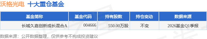 持有沃格光电最多的基金为长城久嘉创新成长混合A,目前规模为24.02亿元,最新净值3.4406(4月23日),较上一交易日下跌3.07%,近一年上涨107.12%。该基金现任基金经理为尤国梁。