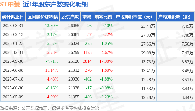 从股价来看,2026年2月13日至2026年3月31日,ST中装区间跌幅为13.3%,在此期间股东户数减少26.0户,减幅为0.1%。