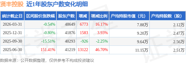 从股价来看,2025年12月31日至2026年3月31日,贤丰控股区间跌幅为0.54%,在此期间股东户数增加6773.0户,增幅为16.17%。