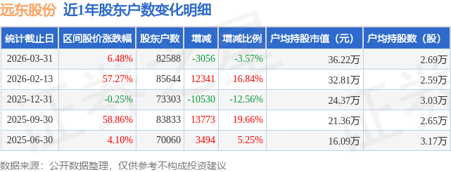 从股价来看,2026年2月13日至2026年3月31日,远东股份区间涨幅为6.48%,在此期间股东户数减少3056.0户,减幅为3.57%。