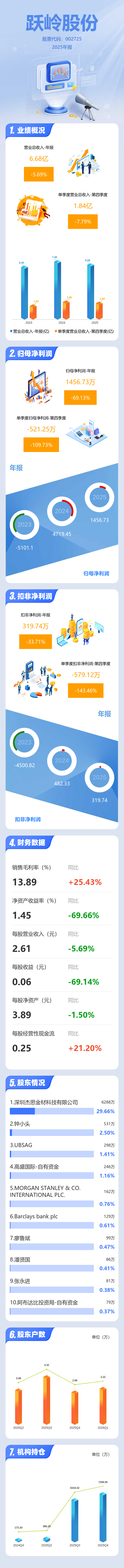 证券之星消息,跃岭股份2025年年报显示,当年度公司主营收入6.68亿元,同比下降5.69%;归母净利润1456.73万元,同比下降69.13%;扣非净利润319.74万元,同比下降33.71%;其中2025年第四季度,公司单季度主营收入1.84亿元,同比下降7.79%;单季度归母净利润-521.25万元,同比下降109.73%;单季度扣非净利润-579.12万元,同比下降143.46%;负债率21.1%,投资收益-674.68万元,财务费用-299.99万元,毛利率13.88%。