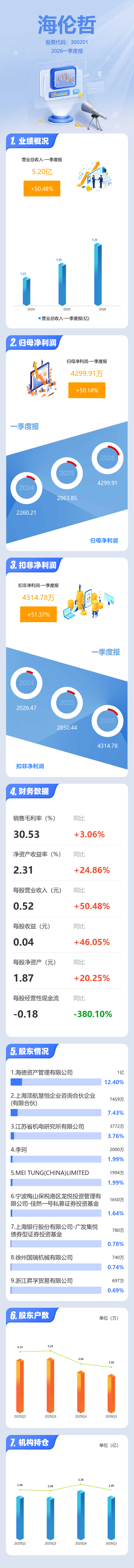 证券之星消息,海伦哲2026年一季报显示,一季度公司主营收入5.2亿元,同比上升50.48%;归母净利润4299.91万元,同比上升50.14%;扣非净利润4314.78万元,同比上升51.37%;负债率40.64%,投资收益-114.17万元,财务费用204.29万元,毛利率30.53%。