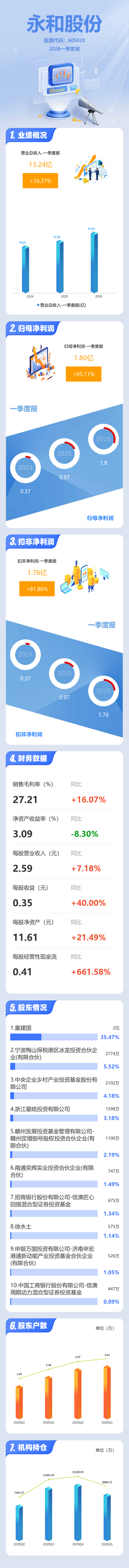 证券之星消息,永和股份2026年一季报显示,一季度公司主营收入13.24亿元,同比上升16.37%;归母净利润1.8亿元,同比上升85.11%;扣非净利润1.76亿元,同比上升81.86%;负债率31.52%,投资收益82.54万元,财务费用1408.06万元,毛利率27.21%。
