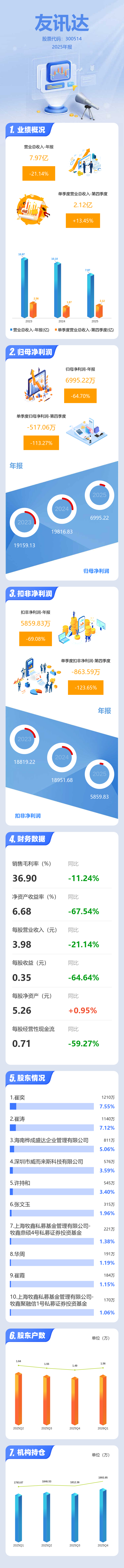 证券之星消息,友讯达2025年年报显示,当年度公司主营收入7.97亿元,同比下降21.15%;归母净利润6995.22万元,同比下降64.7%;扣非净利润5859.83万元,同比下降69.08%;其中2025年第四季度,公司单季度主营收入2.12亿元,同比上升13.45%;单季度归母净利润-517.06万元,同比下降113.27%;单季度扣非净利润-863.59万元,同比下降123.66%;负债率29.33%,投资收益1017.12万元,财务费用-691.72万元,毛利率36.9%。