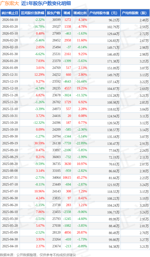 从股价来看,2026年3月31日至2026年4月10日,广东宏大区间跌幅为1.05%,在此期间股东户数增加79.0户,增幅为0.26%。