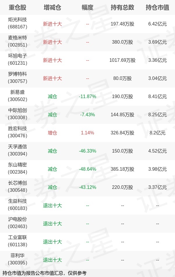 证券之星消息,4月21日德邦基金旗下雷涛 陆阳管理的德邦鑫星价值灵活配置混合型基金公布一季报,近1年净值增长率296.21%。与上一季度相比,该基金前十大重仓股新增炬光科技,麦格米特,环旭电子,罗博特科;其中新易盛持仓占比9.66%,为该基金第一大重仓股;生益科技,沪电股份,工业富联,菲利华等退出前十大重仓股;详细数据如下: