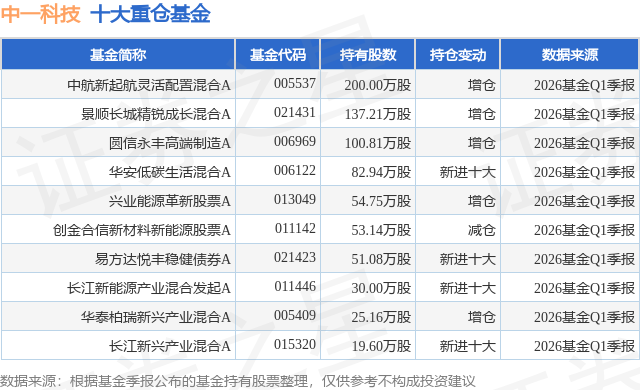 根据2026基金Q1季报公募基金重仓股数据,重仓该股的公募基金共24家,其中持有数量最多的公募基金为中航基金的中航新起航灵活配置混合A。中航新起航灵活配置混合A目前规模为0.9亿元,最新净值0.9654(4月22日),较上一交易日上涨0.06%,近一年上涨83.53%。该公募基金现任基金经理为韩浩。韩浩在任的基金产品包括:中航军民融合精选A,管理时间为2018年2月9日至今,期间收益率为42.83%;中航华证商飞高端制造产业指数发起A,管理时间为2023年3月7日至今,期间收益率为1.94%;中航机遇领航混合发起A,管理时间为2023年8月10日至今,期间收益率为375.35%。