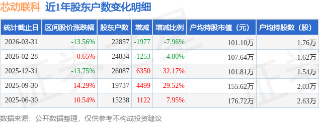 从股价来看,2026年2月28日至2026年3月31日,芯动联科区间跌幅为13.56%,在此期间股东户数减少1977.0户,减幅为7.96%。