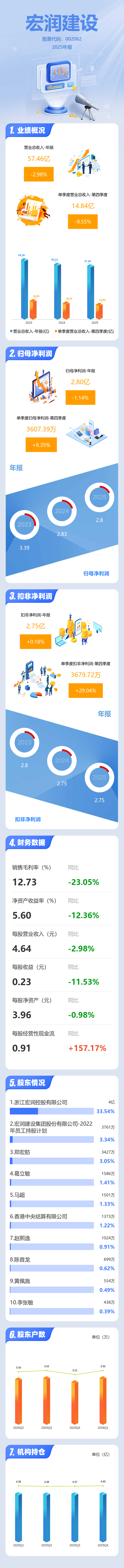 证券之星消息,宏润建设2025年年报显示,当年度公司主营收入57.46亿元,同比下降2.99%;归母净利润2.8亿元,同比下降1.14%;扣非净利润2.75亿元,同比上升0.18%;其中2025年第四季度,公司单季度主营收入14.84亿元,同比下降9.55%;单季度归母净利润3607.39万元,同比上升8.36%;单季度扣非净利润3679.72万元,同比上升29.05%;负债率65.02%,投资收益1075.8万元,财务费用4035.78万元,毛利率12.73%。