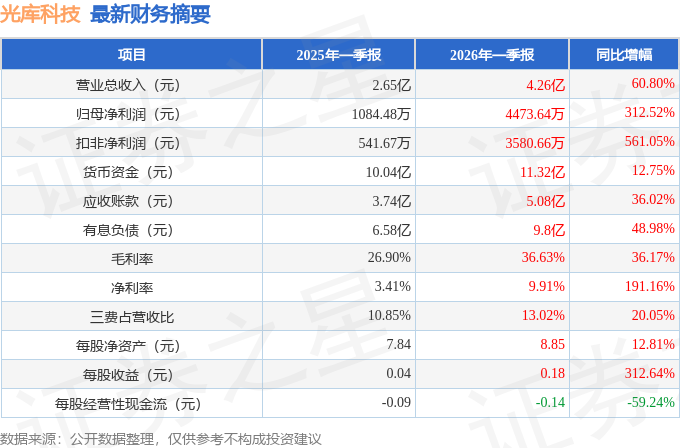 据证券之星公开数据整理,近期光库科技(300620)发布2026年一季报。截至本报告期末,公司营业总收入4.26亿元,同比上升60.8%,归母净利润4473.64万元,同比上升312.52%。按单季度数据看,第一季度营业总收入4.26亿元,同比上升60.8%,第一季度归母净利润4473.64万元,同比上升312.52%。本报告期光库科技应收账款上升,应收账款同比增幅达36.02%。
