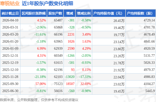 从股价来看,2026年3月31日至2026年4月10日,寒锐钴业区间涨幅为4.52%,在此期间股东户数减少381.0户,减幅为0.58%。