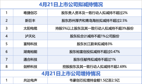 据统计,4月21日,盘后,唯捷创芯、新巨丰、太阳电缆、泸天化、富特科技、湖南裕能、通合科技、剑桥科技在内的8家A股上市公司披露拟减持情况。共达电声披露增持情况。 海量资讯、精准解读,尽在新浪财经APP 责任编辑:张乔松