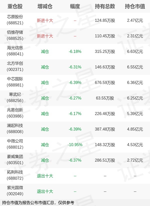 证券之星消息,4月22日国泰基金旗下艾小军管理的国泰CES半导体芯片行业交易型开放式指数基金公布一季报,近1年净值增长率51.03%。与上一季度相比,该基金前十大重仓股新增芯原股份,佰维存储;其中海光信息持仓占比7.61%,为该基金第一大重仓股;拓荆科技,紫光国微等退出前十大重仓股;详细数据如下:以上内容为证券之星据公开信息整理,由AI算法生成(网信算备310104345710301240019号),不构成投资建议。相关 ETF