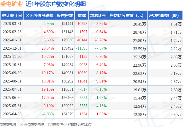 从股价来看,2026年2月28日至2026年3月31日,盛屯矿业区间跌幅为24.9%,在此期间股东户数增加1.03万户,增幅为5.69%。