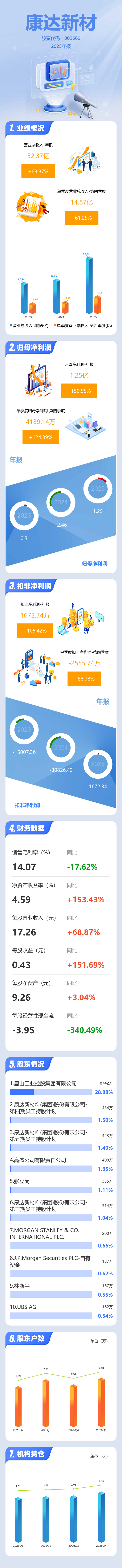 证券之星消息,康达新材2025年年报显示,当年度公司主营收入52.37亿元,同比上升68.87%;归母净利润1.25亿元,同比上升150.96%;扣非净利润1672.34万元,同比上升105.42%;其中2025年第四季度,公司单季度主营收入14.87亿元,同比上升61.25%;单季度归母净利润4139.14万元,同比上升124.39%;单季度扣非净利润-2555.74万元,同比上升88.78%;负债率66.24%,投资收益3014.0万元,财务费用7434.28万元,毛利率14.07%。