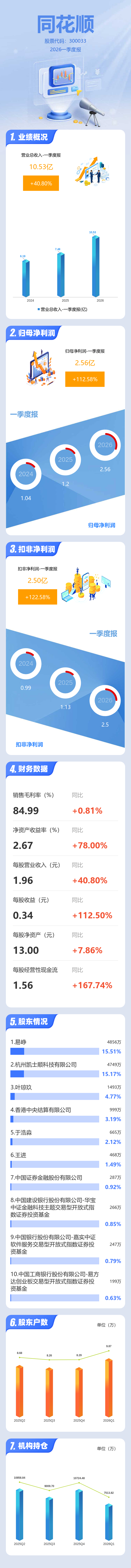 证券之星消息,同花顺2026年一季报显示,一季度公司主营收入10.53亿元,同比上升40.81%;归母净利润2.56亿元,同比上升112.58%;扣非净利润2.5亿元,同比上升122.58%;负债率60.8%,投资收益79.19万元,财务费用-4670.78万元,毛利率84.99%。