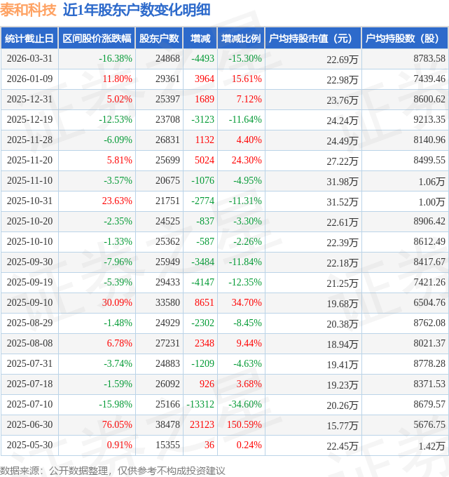 从股价来看,2026年1月9日至2026年3月31日,泰和科技区间跌幅为16.38%,在此期间股东户数减少4493.0户,减幅为15.3%。