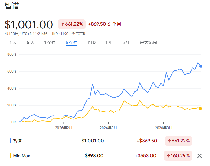 智谱和MiniMax于2026年1月先后登陆港股,此后股价一路飙升,截至4月23日累计涨幅约5-8倍。其中,智谱从116.20港元上市价格,涨到1001港元。它们是目前全球仅有的两家纯前沿AI大模型上市公司,稀缺性本身就是溢价。