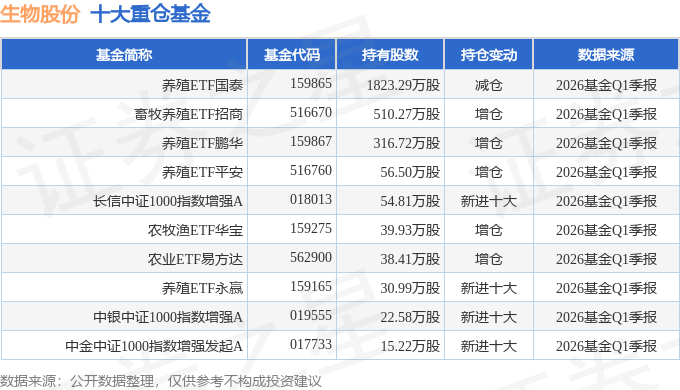 持有生物股份最多的基金为养殖ETF国泰,目前规模为47.41亿元,最新净值0.6068(4月23日),较上一交易日下跌1.57%,近一年上涨3.41%。该基金现任基金经理为梁杏。