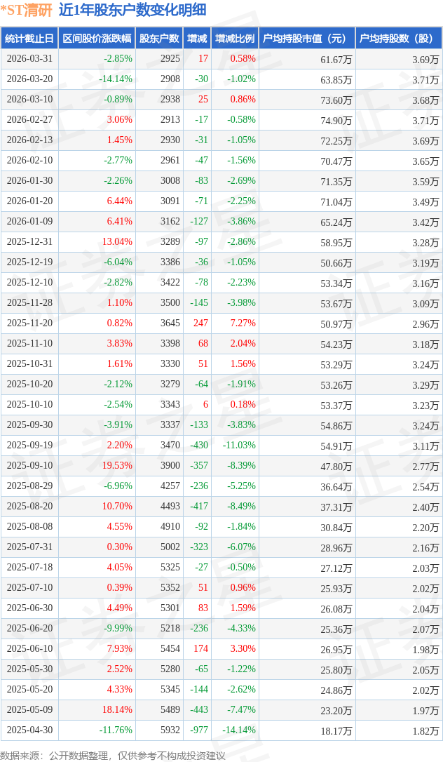 从股价来看,2026年3月20日至2026年3月31日,*ST清研区间跌幅为2.85%,在此期间股东户数增加17.0户,增幅为0.58%。