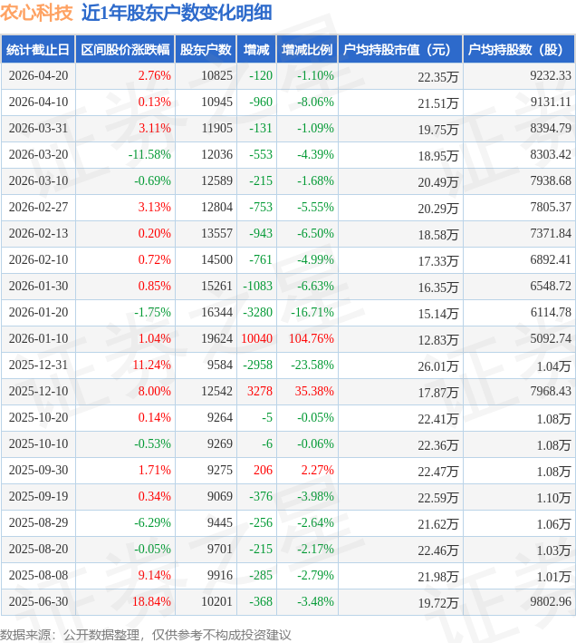 从股价来看,2026年4月10日至2026年4月20日,农心科技区间涨幅为2.76%,在此期间股东户数减少120.0户,减幅为1.1%。