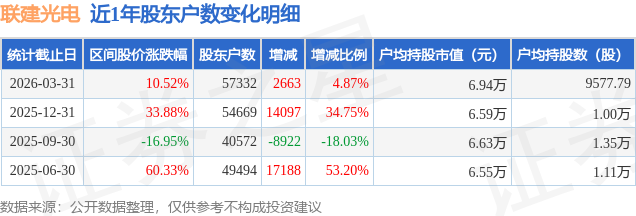从股价来看,2025年12月31日至2026年3月31日,联建光电区间涨幅为10.52%,在此期间股东户数增加2663.0户,增幅为4.87%。