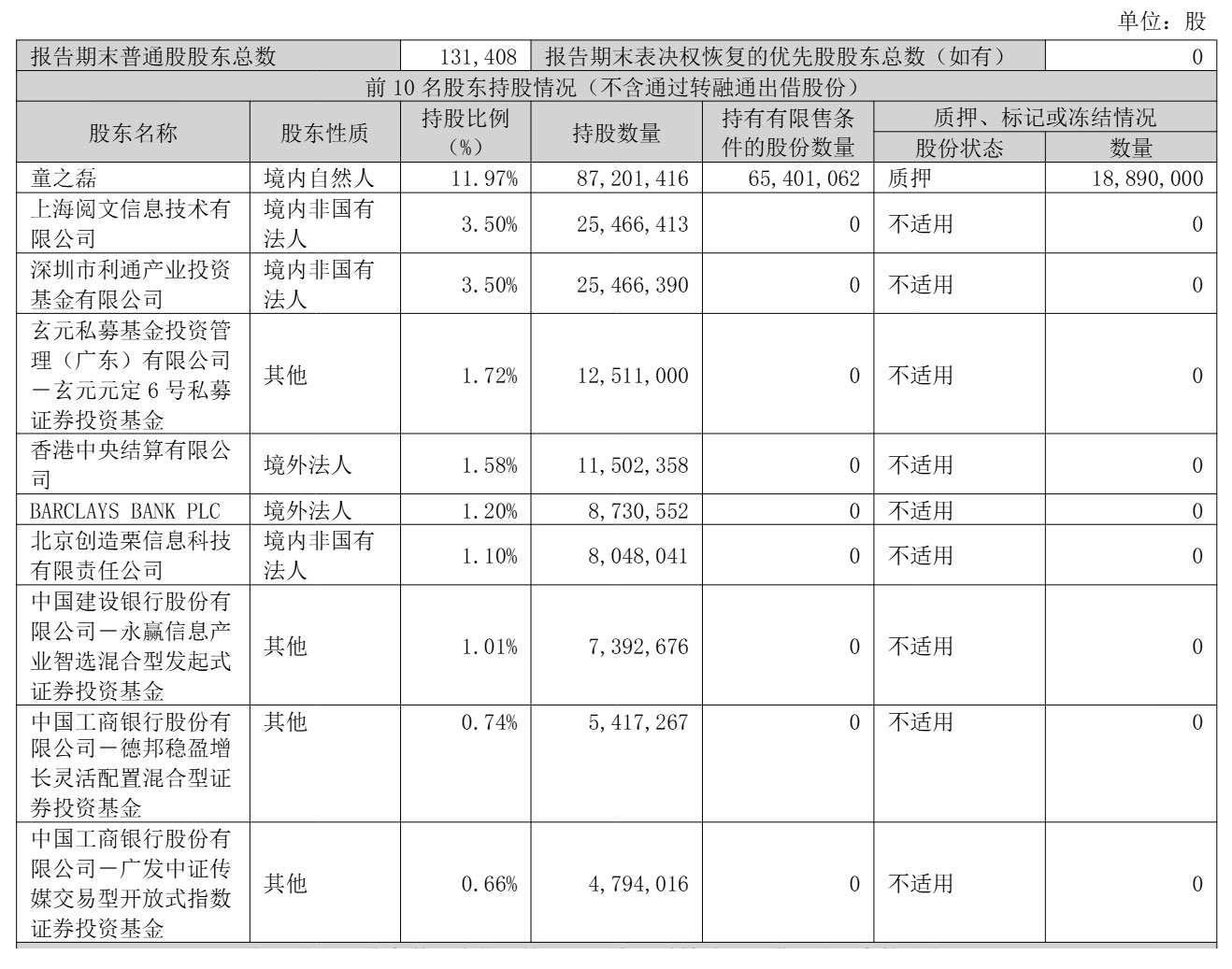 截至2026年3月31日,中文在线实控人童之磊持股为11.97%,上海阅文信息技术有限公司持股为3.5%,深圳市利通产业投资基金有限公司持股为3.5%,玄元私募基金投资管理(广东)有限公司-玄元元定 6 号私募证券投资基金持股为1.72%;
