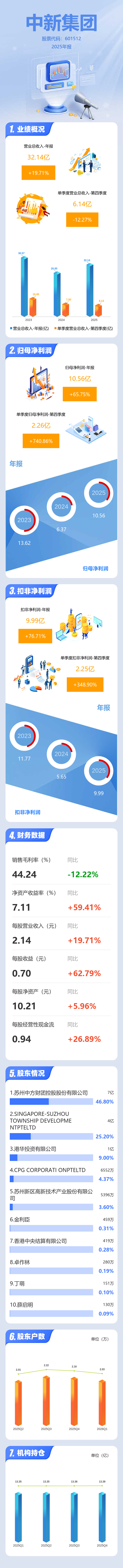 证券之星消息,中新集团2025年年报显示,当年度公司主营收入32.14亿元,同比上升19.71%;归母净利润10.56亿元,同比上升65.75%;扣非净利润9.99亿元,同比上升76.72%;其中2025年第四季度,公司单季度主营收入6.14亿元,同比下降12.28%;单季度归母净利润2.26亿元,同比上升740.87%;单季度扣非净利润2.25亿元,同比上升348.91%;负债率44.52%,投资收益3.63亿元,财务费用2.01亿元,毛利率44.24%。