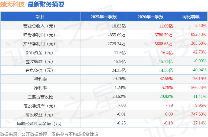 据证券之星公开数据整理,近期楚天科技(300358)发布2026年一季报。截至本报告期末,公司营业总收入11.09亿元,同比上升2.4%,归母净利润6780.79万元,同比上升892.43%。按单季度数据看,第一季度营业总收入11.09亿元,同比上升2.4%,第一季度归母净利润6780.79万元,同比上升892.43%。本报告期楚天科技盈利能力上升,毛利率同比增幅26.19%,净利率同比增幅566.24%。