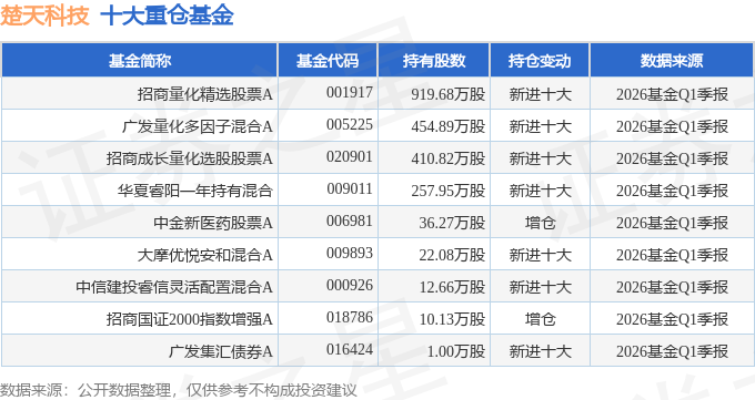 持有楚天科技最多的基金为招商量化精选股票A,目前规模为36.47亿元,最新净值3.6903(4月23日),较上一交易日下跌1.33%,近一年上涨39.77%。该基金现任基金经理为王平。