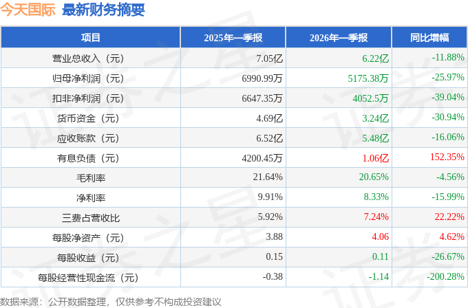 据证券之星公开数据整理,近期今天国际(300532)发布2026年一季报。截至本报告期末,公司营业总收入6.22亿元,同比下降11.88%,归母净利润5175.38万元,同比下降25.97%。按单季度数据看,第一季度营业总收入6.22亿元,同比下降11.88%,第一季度归母净利润5175.38万元,同比下降25.97%。本报告期今天国际存货明显上升,存货同比增幅达57.97%。