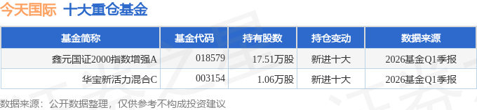 持有今天国际最多的基金为鑫元国证2000指数增强A,目前规模为1.99亿元,最新净值1.5145(4月23日),较上一交易日下跌0.1%,近一年上涨43.66%。该基金现任基金经理为刘宇涛 肖涵。