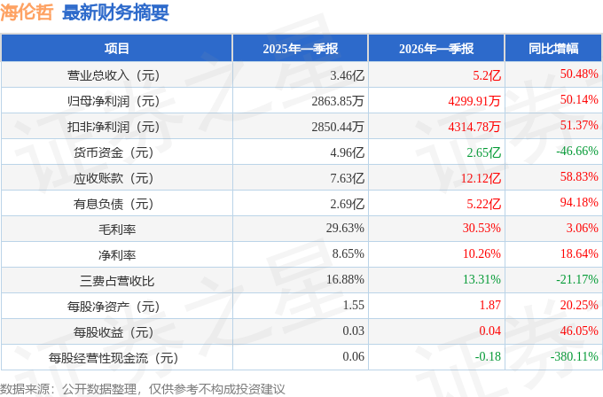 据证券之星公开数据整理,近期海伦哲(300201)发布2026年一季报。截至本报告期末,公司营业总收入5.2亿元,同比上升50.48%,归母净利润4299.91万元,同比上升50.14%。按单季度数据看,第一季度营业总收入5.2亿元,同比上升50.48%,第一季度归母净利润4299.91万元,同比上升50.14%。本报告期海伦哲应收账款上升,应收账款同比增幅达58.83%。