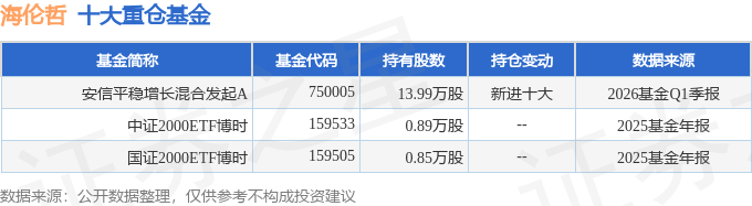 持有海伦哲最多的基金为安信平稳增长混合发起A,目前规模为0.14亿元,最新净值1.487(4月21日),较上一交易日下跌0.52%,近一年上涨20.09%。该基金现任基金经理为张立聪。