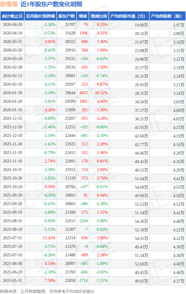 从股价来看,2026年4月10日至2026年4月20日,珍宝岛区间跌幅为2.34%,在此期间股东户数增加79.0户,增幅为0.25%。