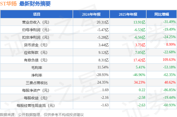 据证券之星公开数据整理,近期ST华扬(603825)发布2025年年报。截至本报告期末,公司营业总收入13.91亿元,同比下降31.49%,归母净利润-6.53亿元,同比下降19.49%。按单季度数据看,第四季度营业总收入4.26亿元,同比上升85.4%,第四季度归母净利润-3.86亿元,同比下降19.96%。本报告期ST华扬三费占比上升明显,财务费用、销售费用和管理费用总和占总营收同比增幅达40.62%。